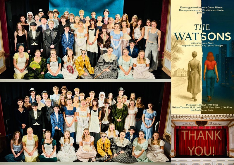 Die achten Klassen begeisterten mit den Englisch-Theateraufführungen von THE WATSONS (Stück: Laura Wade) mehr als 650 BesucherInnen im Stadttheater Grein. Die auf einem unfertigen Text von Jane Austen beruhende Geschichte, nahm das Publikum auf eine abwechslungsreiche und humorvolle Reise mit. Regie führte Lynsey Thurgar, die selbst Teil des Musicalensembles am Linzer Musiktheater ist. Den Schüler:innen der achten Klassen gratulieren wir herzlich zu fünf äußerst gelungenen Theaterabenden!