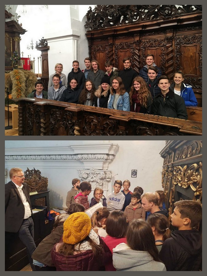 3b: Am 15.10. besuchte die 3b die Ausstellung "Barock – Schein & Sein" im Machland-Dom zu Baumgartenberg. Und dank unseres Kulturvermittlers Gerhard Schwandl wurde es eine besonders lebendige Geschichte (GSPB)-Stunde. Zuerst entdeckten die SchülerInnen an der bekannten Außenfassade bisher für sie noch unbekannte Details und lernten vor Ort die Baustile Romanik, Gotik und Barock kennen. Dann ging es durch die große Sakristei ins Kircheninnere. Dort ging die Suche nach Elementen des Barock weiter: Jede/r Schüler/in bekam einen Bildausschnitt, den es im Inneren des Doms wiederzufinden galt. Der von der Pfarrgemeinde neu gestaltete Film und die Ausstellung gaben einen vielschichtigen Einblick in die Lebensumstände des 17. und 18. Jahrhunderts, beleuchteten, aber auch die Reformations- und Gegenreformationszeit sowie die Zeit des 30-jährigen Krieges. Musikalisch live begleitet wurden sie dabei vom Baumgartenberger Stiftsorganisten Sean Maxwell auf der bekannten Freundt-Orgel.