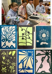 Die 1b-Klasse verwandelte kürzlich den Zeichensaal zur Druckwerkstatt. Ein Schablonendruck zum Thema ‚Frühling‘ stand auf dem Programm. So setzten sich die SchülerInnen mit den wichtigsten Arbeitsschritten auseinander: mit dem Gestalten eines passendes Motivs, der richtigen Umsetzung des Entwurfs, dem Schneiden der Schablonen sowie dem Umgang mit der Druckerpresse.