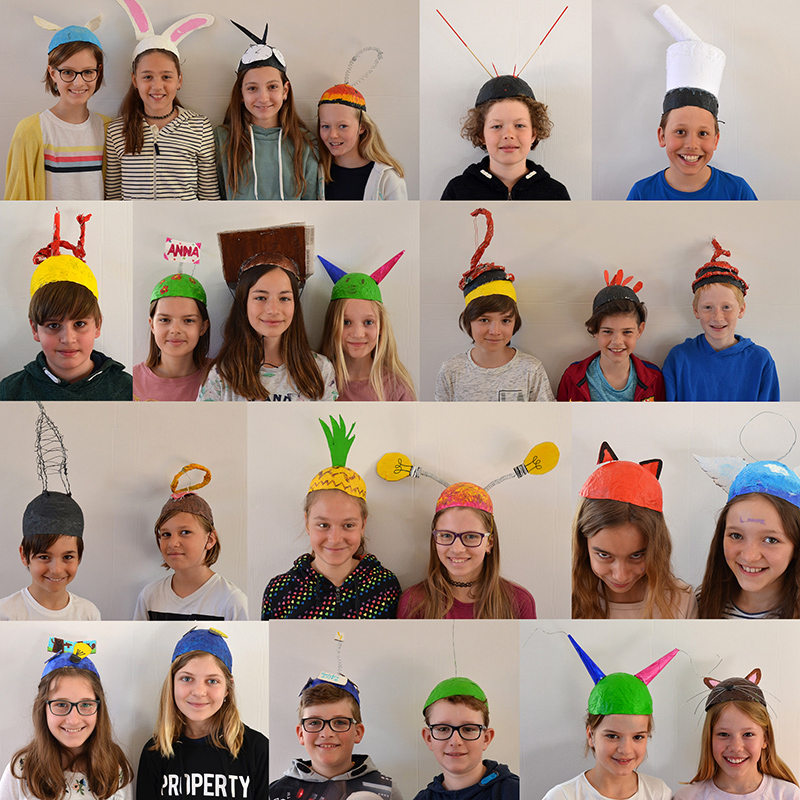Dann wurden mit mehreren Schichten Papier unter Zuhilfenahme von Draht und anderen Materialien die individuellen Stücke gefertigt und bemalt. Ob erleuchtende Glühbirnen, Antennen oder beflügelnde Helme - die Geistesblitze können kommen!
