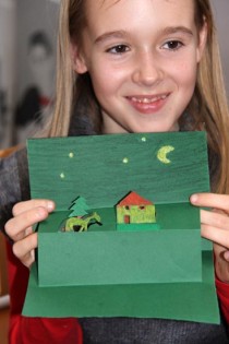 Die 1 b Klasse hat heuer Weihnachtskarten mit Pop-Up-Inhalt gemacht – beim Öffnen der Karten entstehen kleine Welten, die in unterschiedlicher Weise von den SchülerInnen auf färbigem Tonpapier gestaltet wurden.