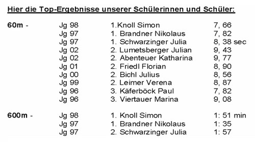 Insgesamt 11 Medaillen (5xGold, 6xSilber und 2xBronze) erkämpften die SchülerInnen des Europagymnasiums Baumgartenberg. Dies brachte in der Schulwertung den 3. Platz in der Unterstufe und den 2. Platz in der Oberstufe, geschlagen nur von den Riesenschulen mit teilweise sportlichem Schwerpunkt aus Amstetten. Herausragende Leistungen erbrachten Nikolaus Brandner und Simon Knoll, die sich zu Doppelolympiasiegern (60m-Sprint und 600m-Lauf) kürten. Julia Schwarzinger beeindruckte einmal mehr mit der Tagesbestleistung im Sprint!![]()