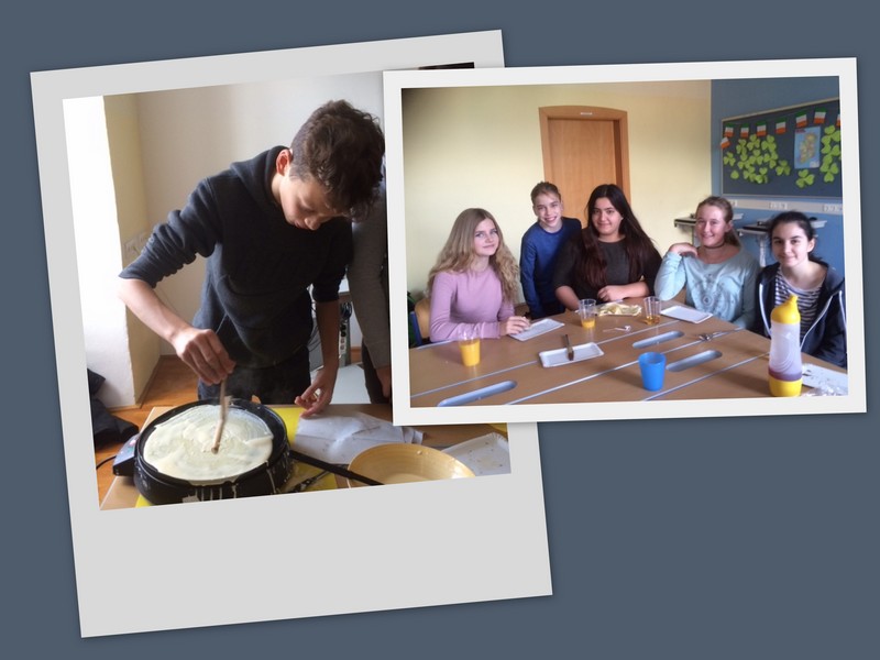 Danach machte sich Ermin sofort „ran an die Crepe-Pfanne“ und bereitete die köstliche Süßspeise auf Wunsch auch für andere Mitschüler zu. Auch wenn manche Versuche scheiterten, hatten wir dennoch viel Spaß. Ein Französisch-Pool, der noch lange in Erinnerung bleibt.